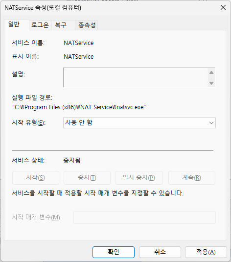 서비스 상태를 중지로 변경하고, 시작 유형을 사용안함으로 변경하고 적용하면 된다.