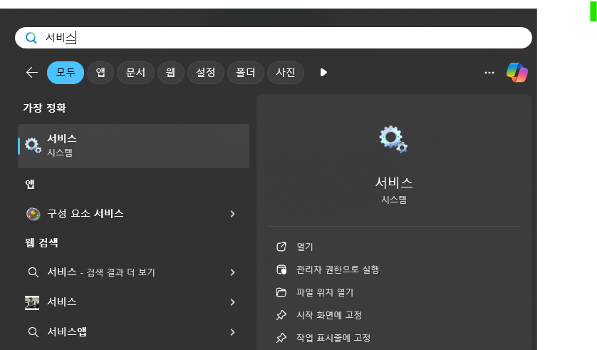 메뉴에서 서비스를 검색하여 실행시키거나 제어판 > 시스템 및 보안 > 관리도구 > 서비스,